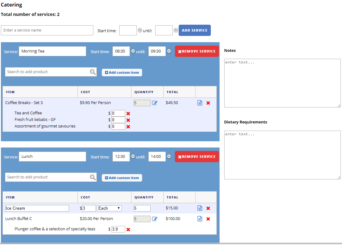 6. You have the option to fill in the Catering Notes and Dietary notes when applicable.