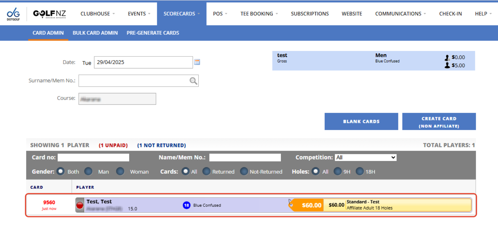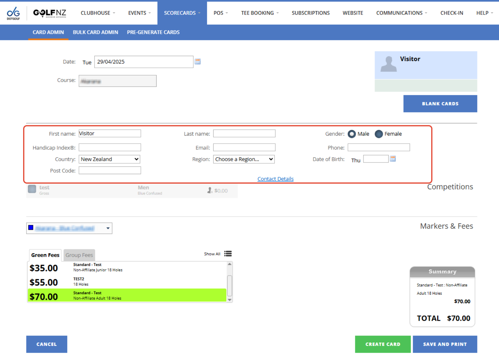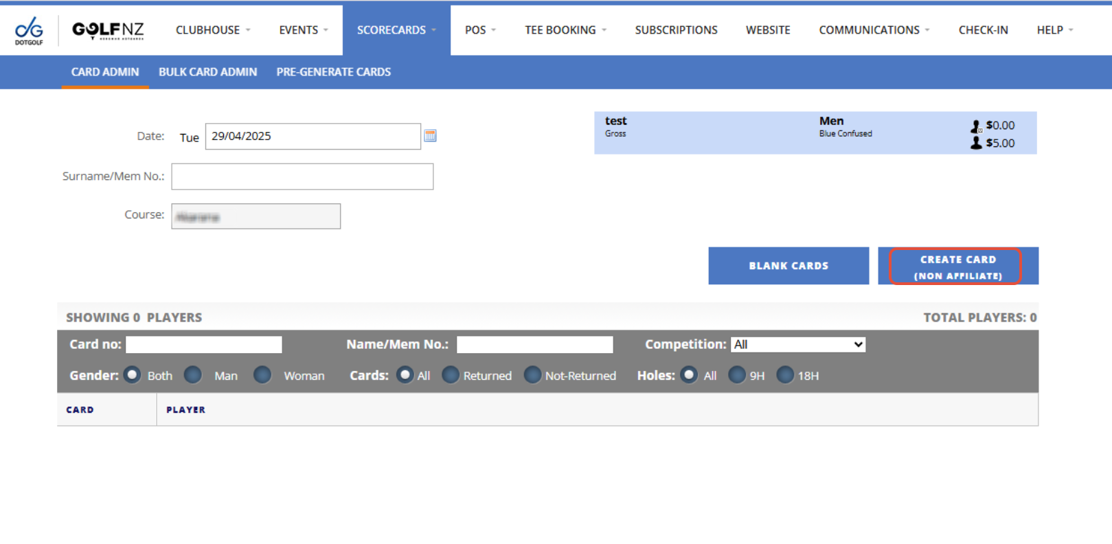 Create Card - This will allocate and generate the player a card number, while also adding in a Digital Scorecard to the players Golf NZ App.