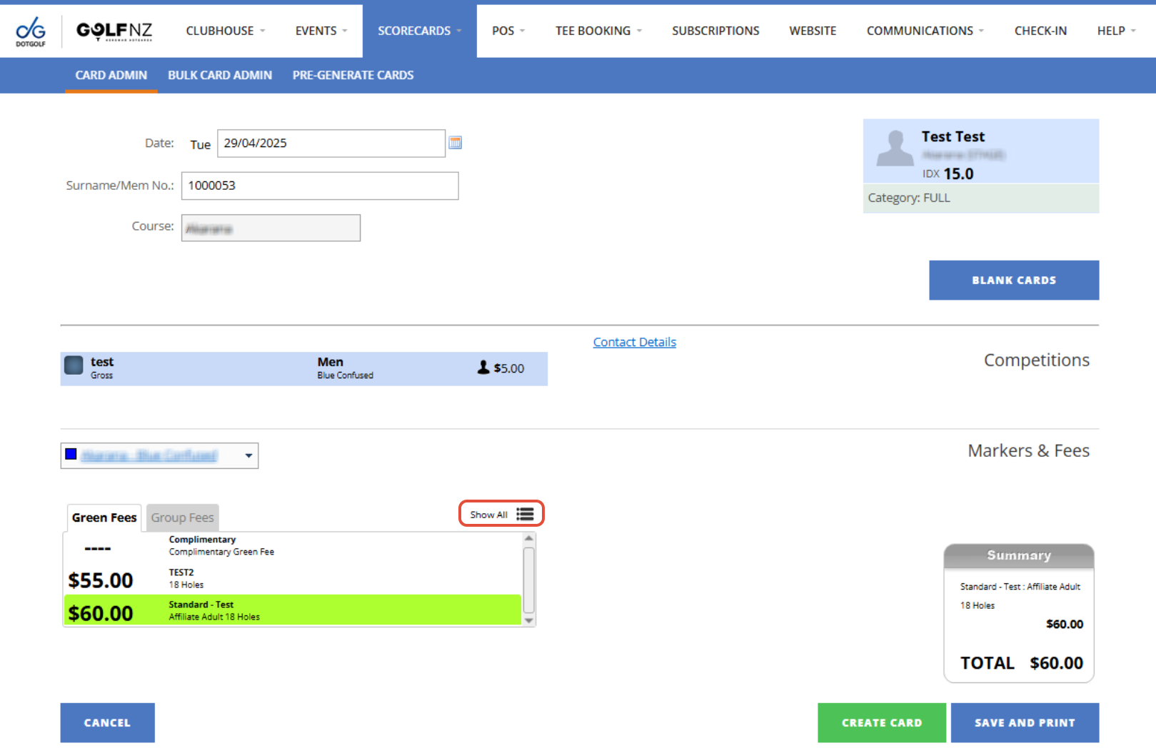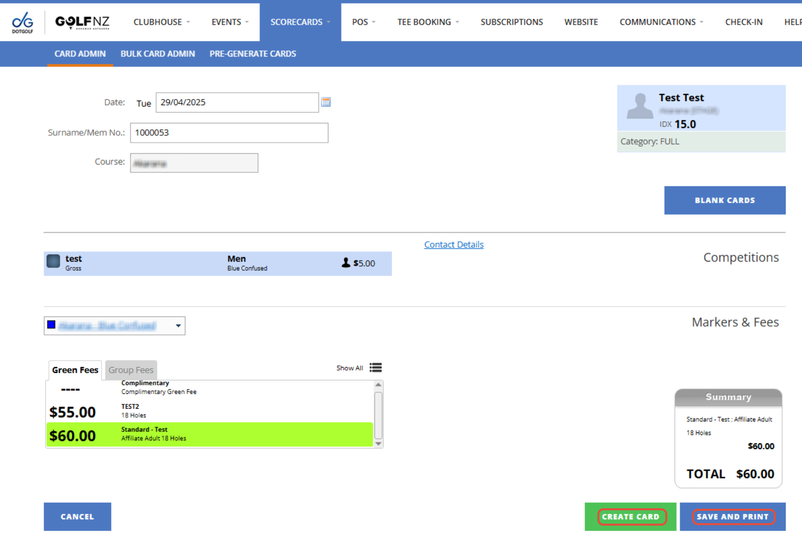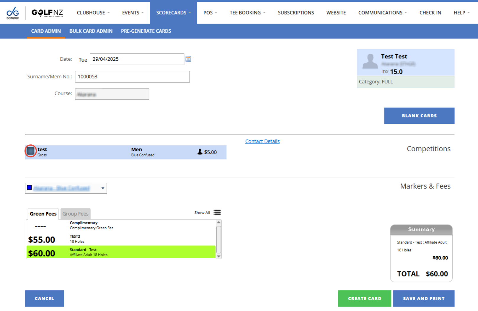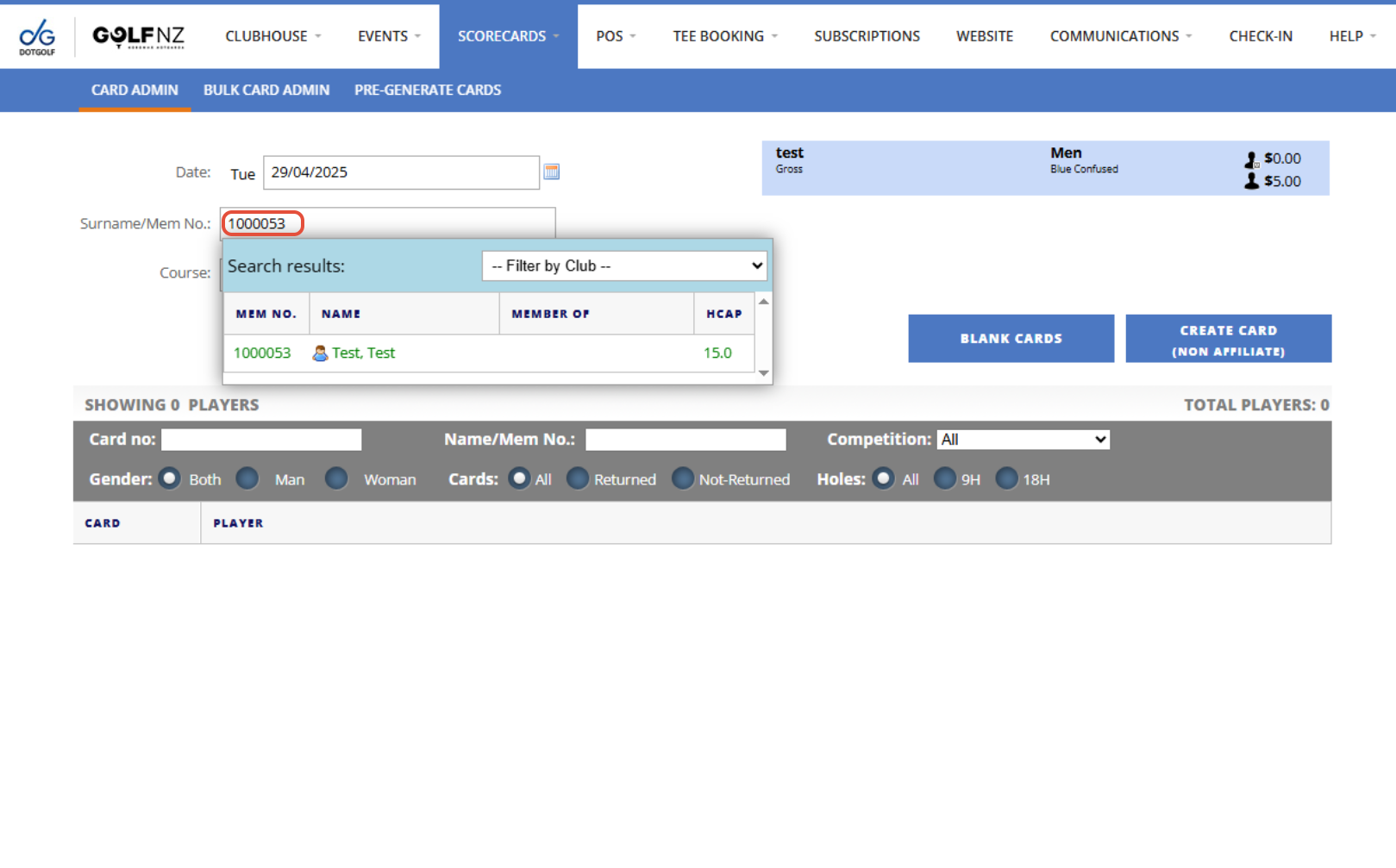 Create Card - This will allocate and generate the player a card number, while also adding in a Digital Scorecard to the players Golf NZ App.