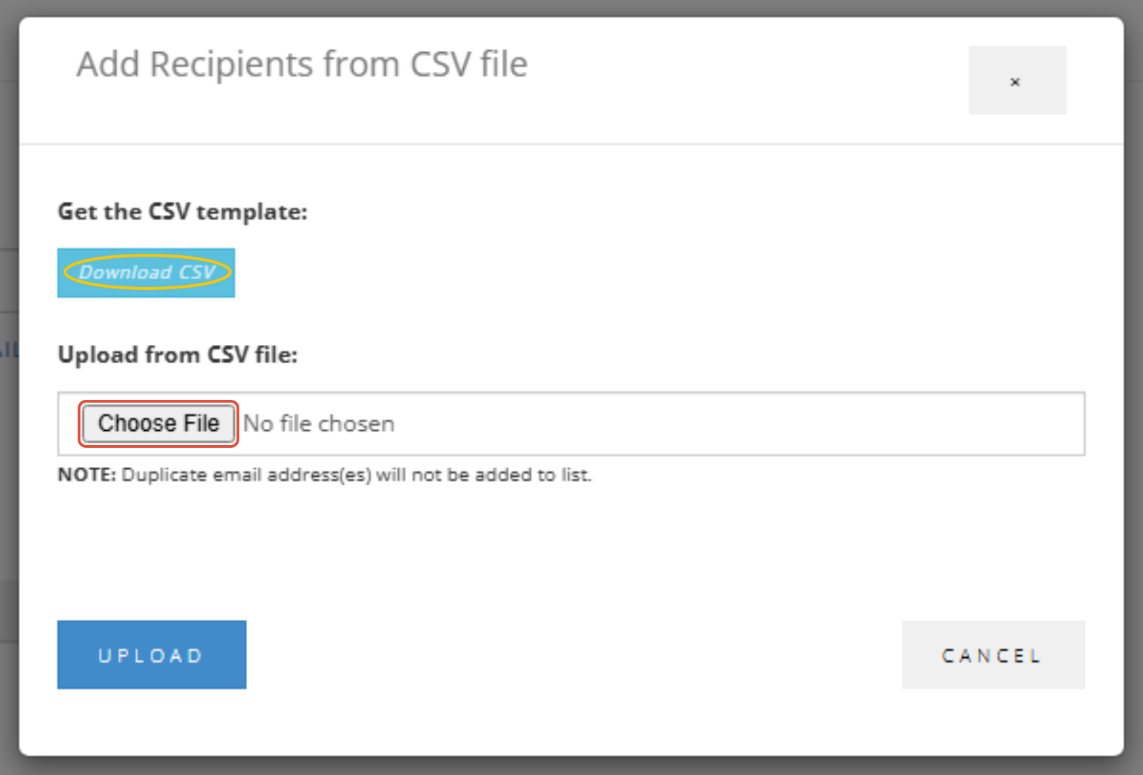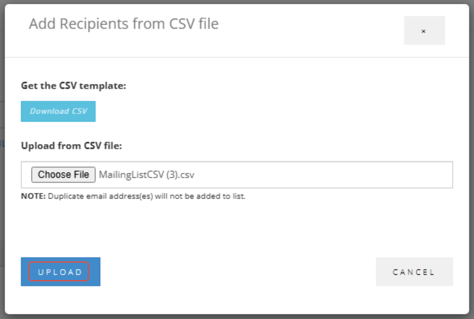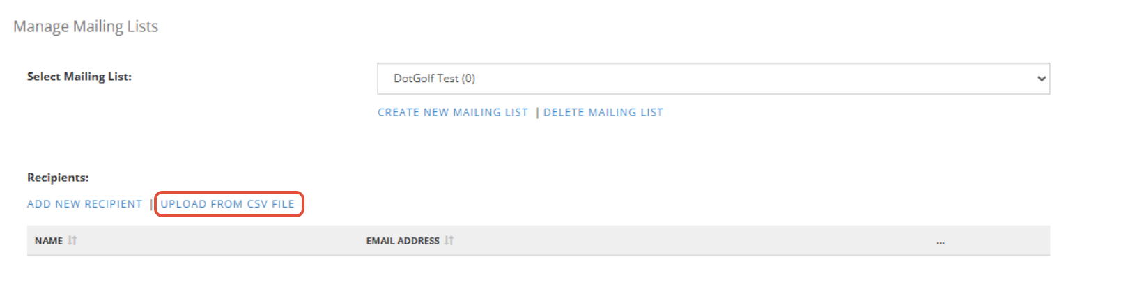 1. Select a Mailing List from the dropdown. Click Upload from CSV File.